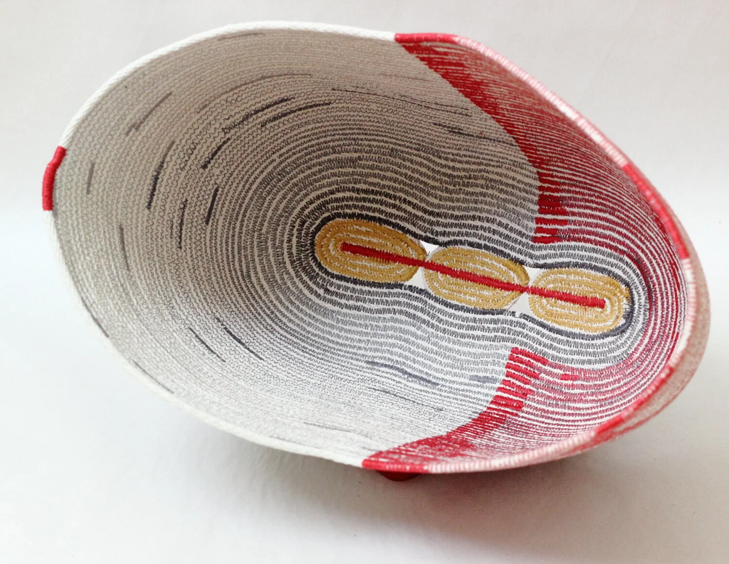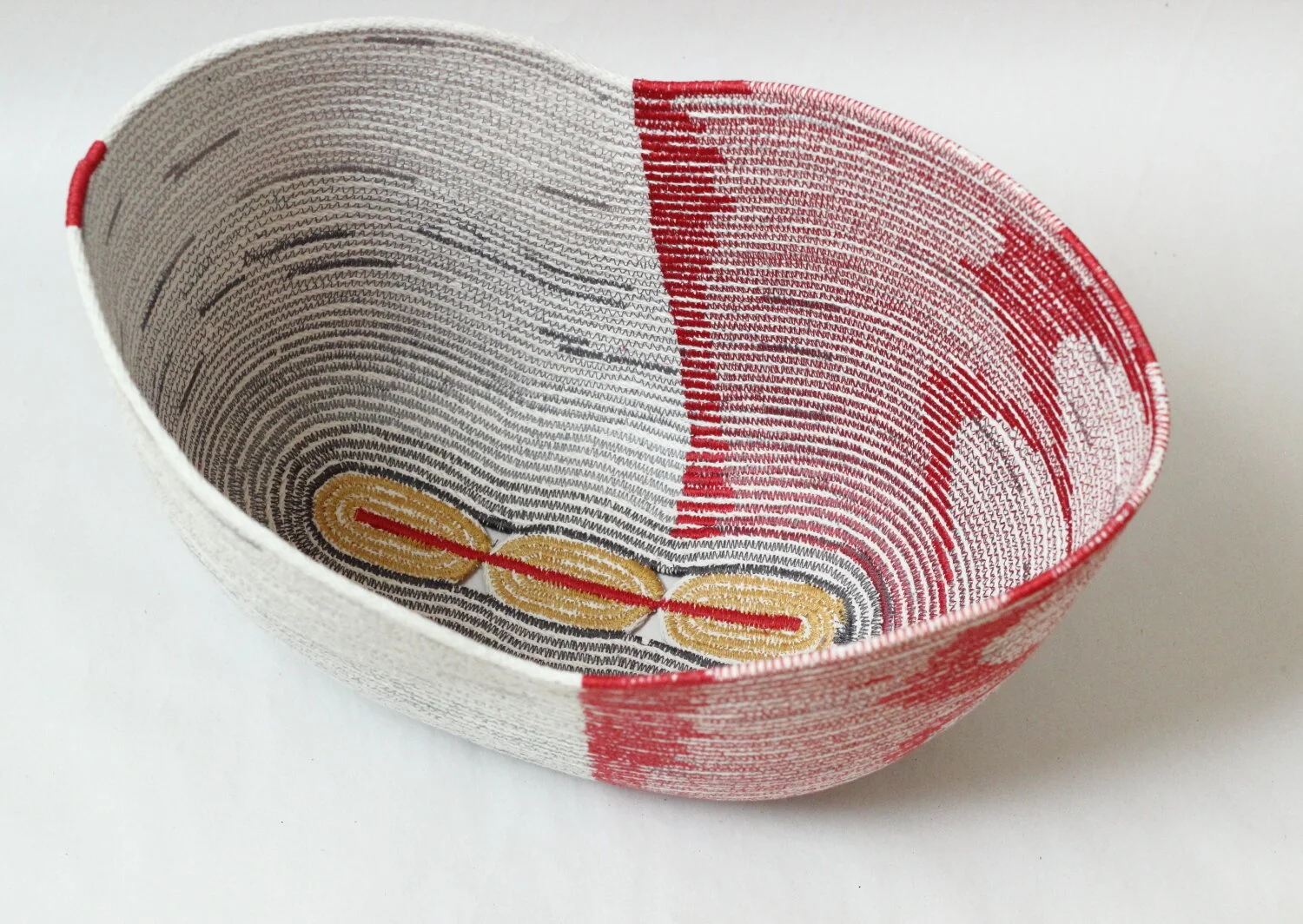 My process is iterative, spiraling from the center, and building up several visual languages while I’m sculpting the shape of the vessel with my industrial sewing machine(s). The work is analogous to a landscape with its layering of topography, vegetation, memory, (etc.) interwoven to form our experience of space.